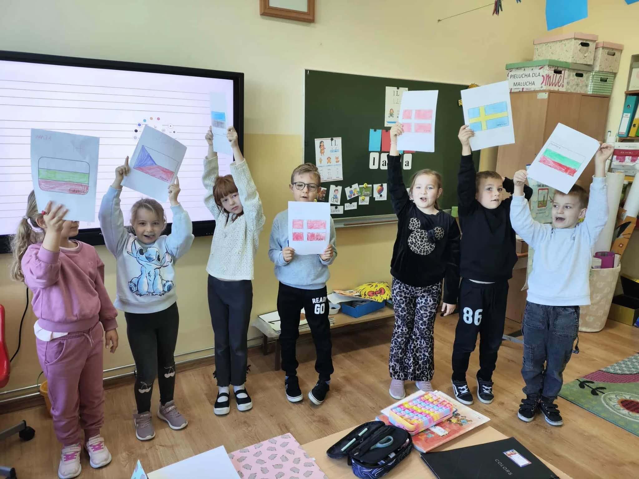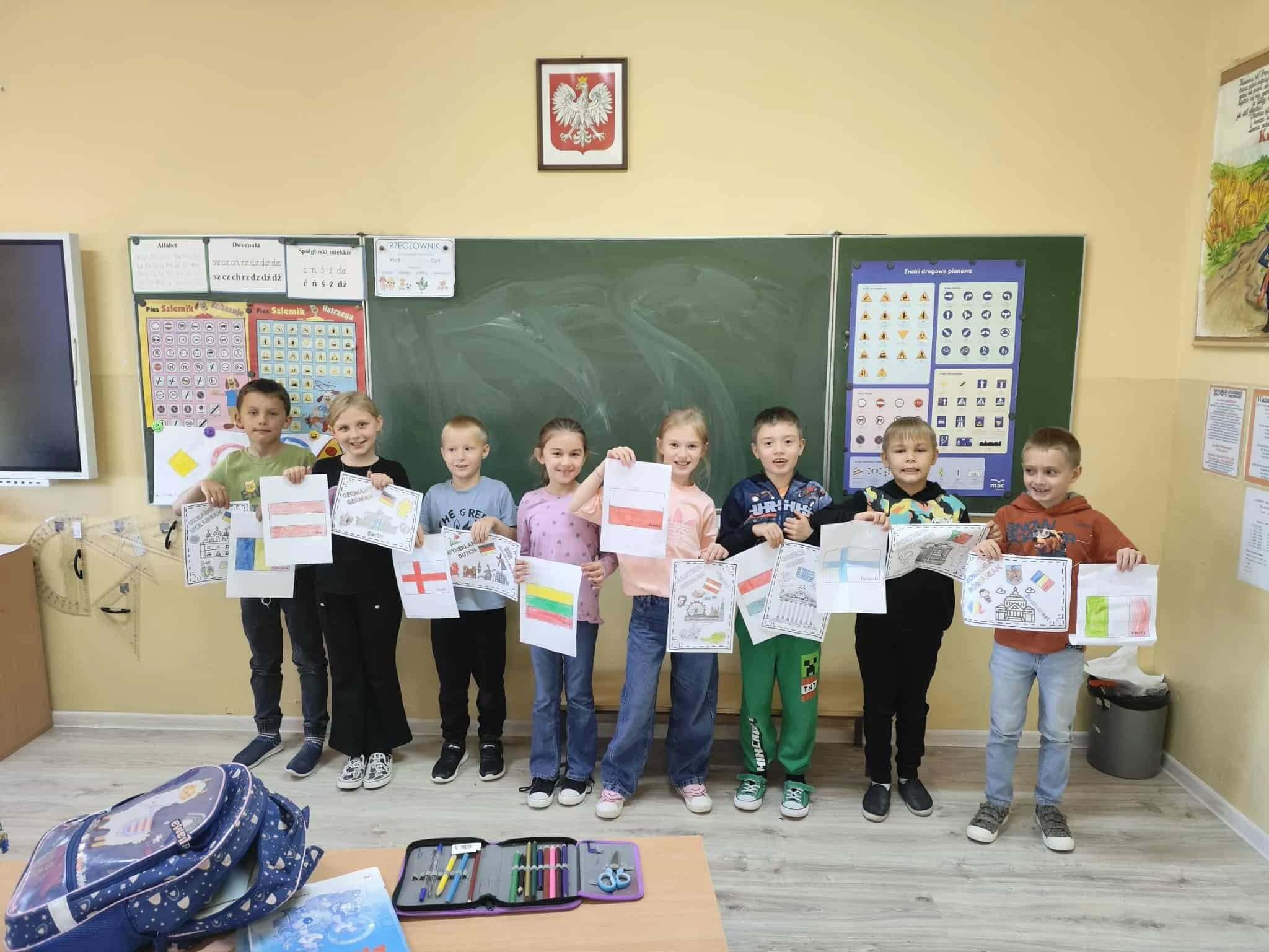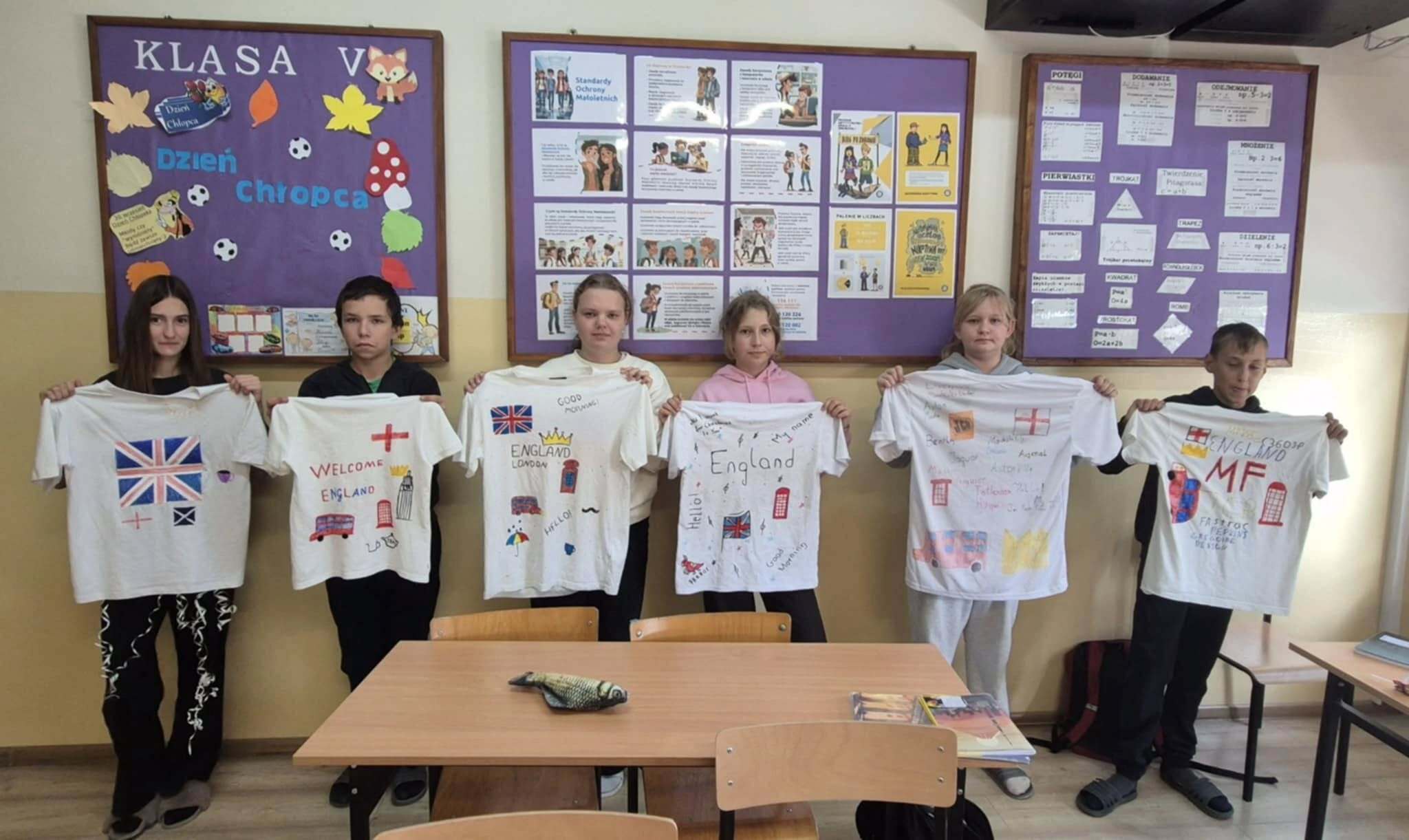 Uczniowie klas 7 i 8 przygotowali projekty koszulek z symbolami Wielkiej Brytanii i Niemiec, natomiast najmłodsi – klasy 1–3 – wykonali lapbooki o krajach europejskich oraz kolorowe flagi.