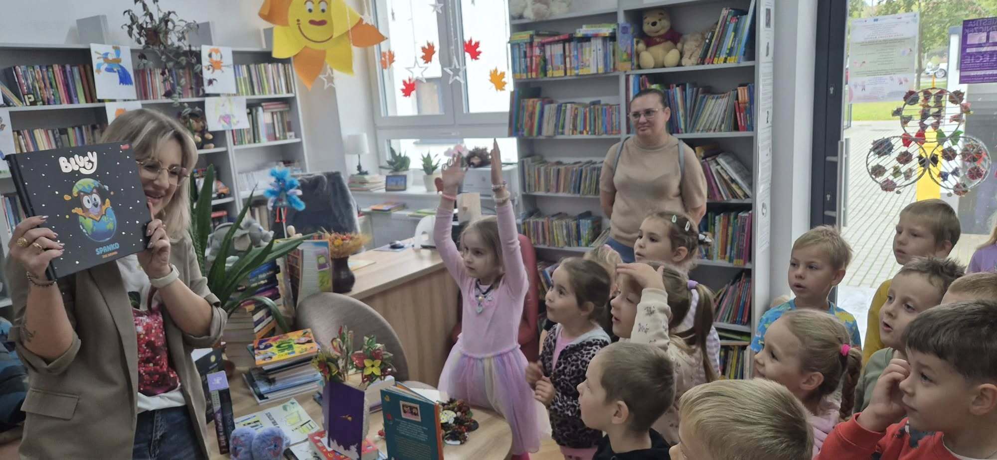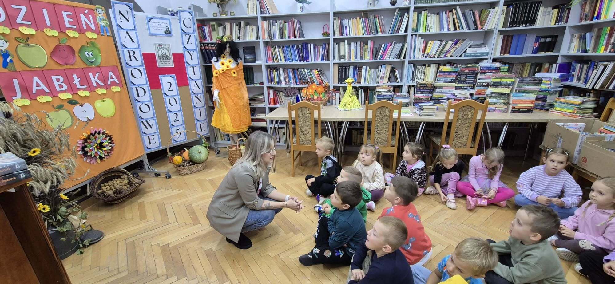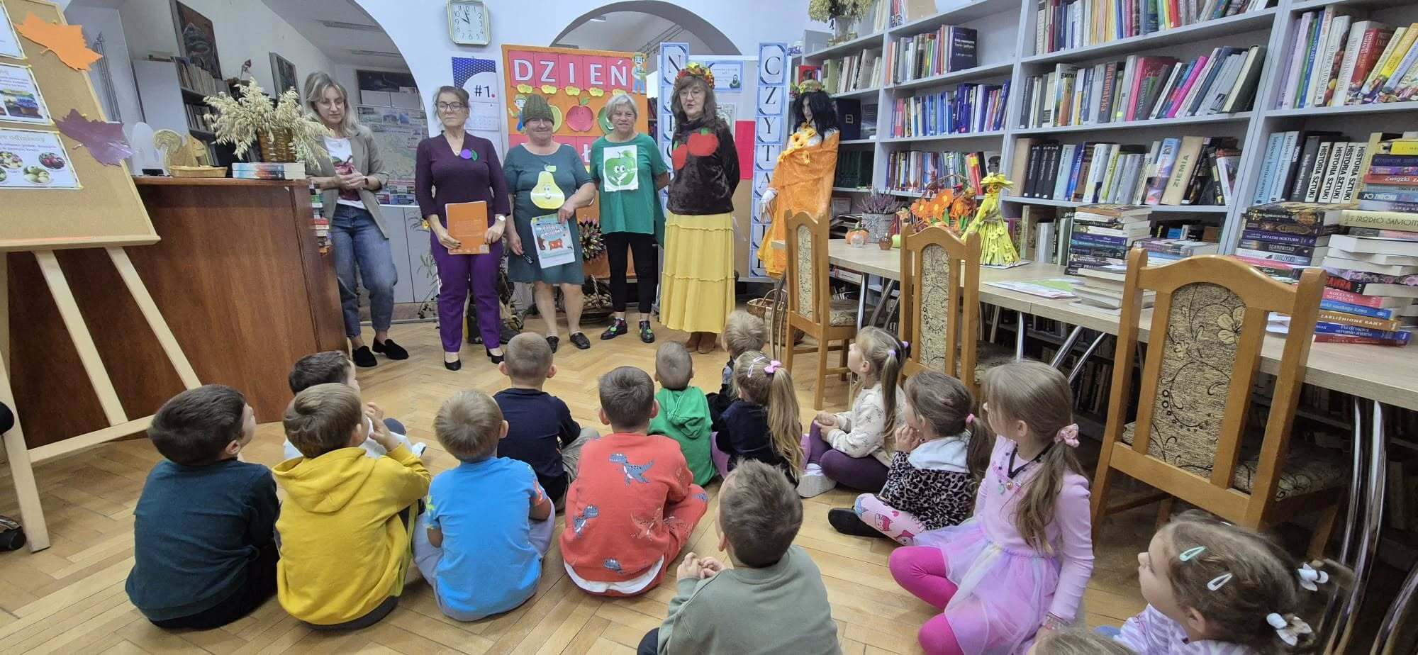 Jesienne warsztaty biblioteczne dla dzieci z grupy "Sówki" w Bibliotece Publicznej w Izbicy Kujawskiej połączone z obchodami Dnia Jabłka i akcją "Głośnego Czytania".